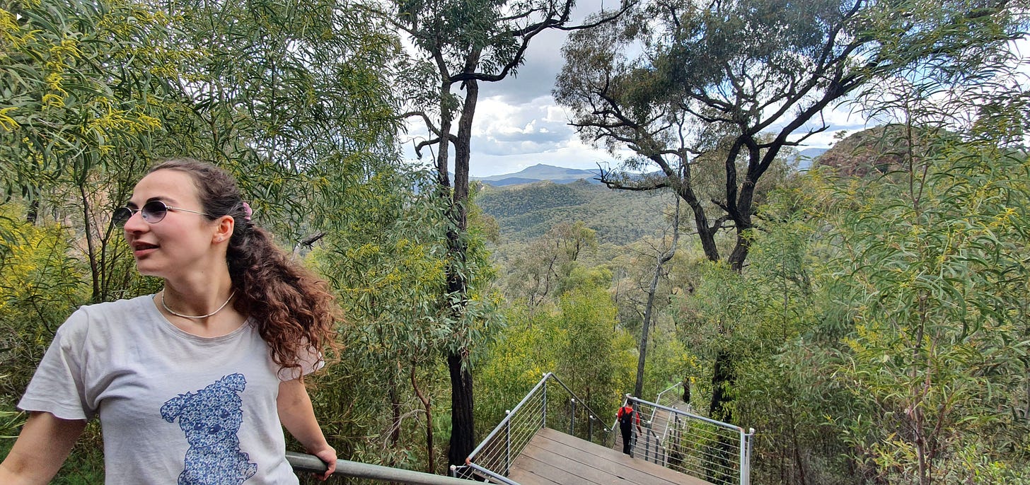 This is a photographer’s dream. Breadknife Gap is literally a skinny gap between two thin and sharp rocks that reach to the sunlight. We couldn’t take pictures, as there was a line of hikers trying to get through. We climbed on stone stairs, through the crack between the rocks. Looking around reminded me of the Avatar world without the fluorescent colours (because it’s Australia and the countryside is very dry).