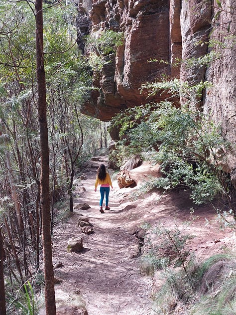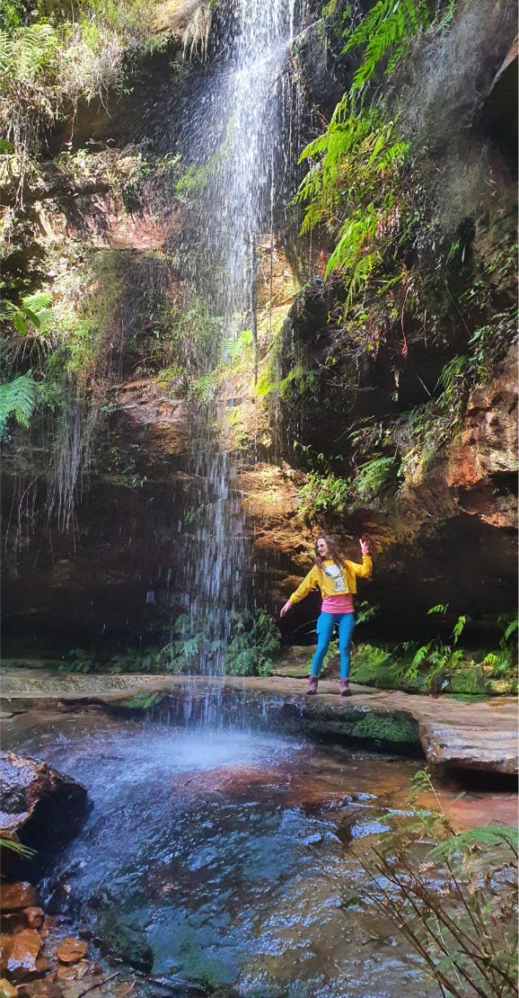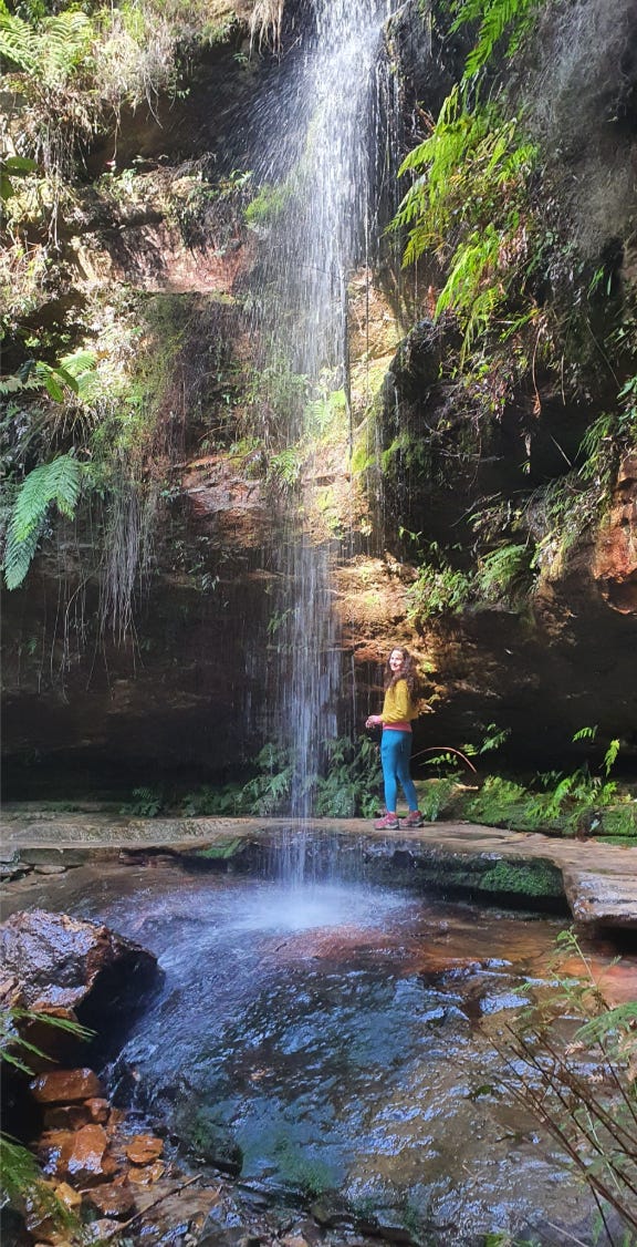 There is a stone steps section in front of a large waterfall. My first hike in Australia was at age 10. Mum took a picture of me standing in front of that waterfall with arms wide open, a big smile, red glasses, and a bird feather stuck in my hair (my understanding of fashion back then was a little different). I remember feeling very adventurous and accomplished. Unfortunately, I lost that picture.