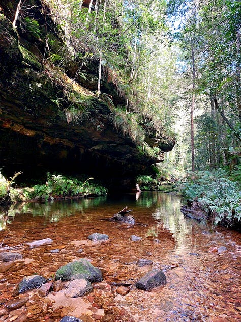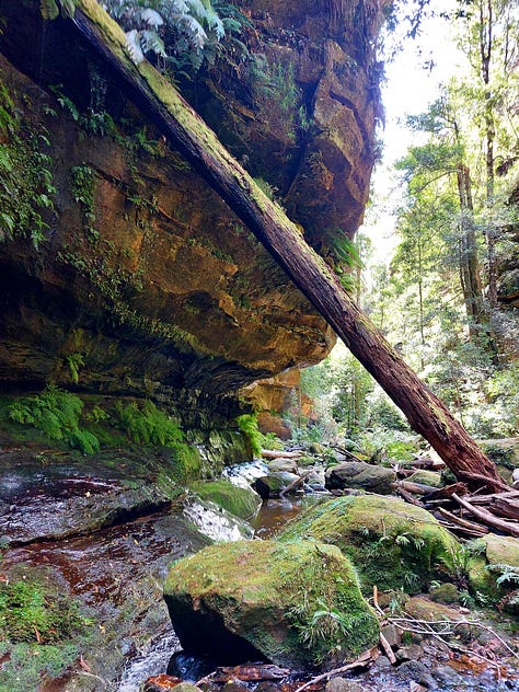 We reached a shallow creek (or waterway) with stones to step over. Ferns behind us and mosses ahead, this place was quite inspiring. Surprisingly, the trail was not even busy. We saw 7 other people — two couples and a trio. I expected a busy day, given how much traffic the Blue Mountains gets most weekends.