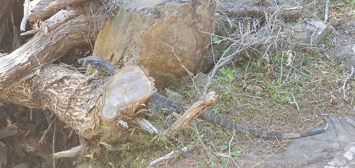 We saw echidnas and large goannas in this area. I feel like there are two different types of goannas — the older, slow goanna with wise, thoughtful steps, and the manic, fast, younger goanna that runs up a tree as soon as they see a person.