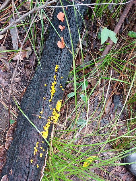 There has been some landslides on the trail. The route was along a dry eucalyptus forest. We spotted some leeches and lots of colourful fungi (mostly yellow and orange). There are 4 or 5 crossings of the Nattai River — none of them were deep or challenging. There are rocks that you just step on to cross. About halfway towards Emmett’s Flat, the trail will start following the Nattai River.