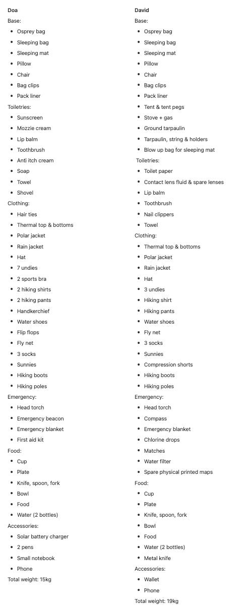 We double-packed a few of the toiletries, I took too many undies, we never had a fly issue (so the nets were useless), never used plastic cups, knives or plates, and a few other things which were ‘nice to haves’ and not that necessary. We also want to swap a few pieces of equipment to find lighter versions.